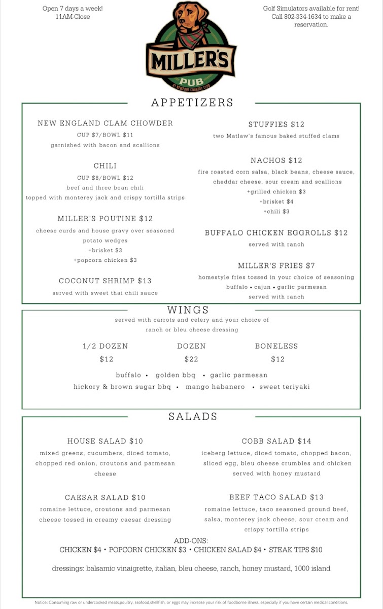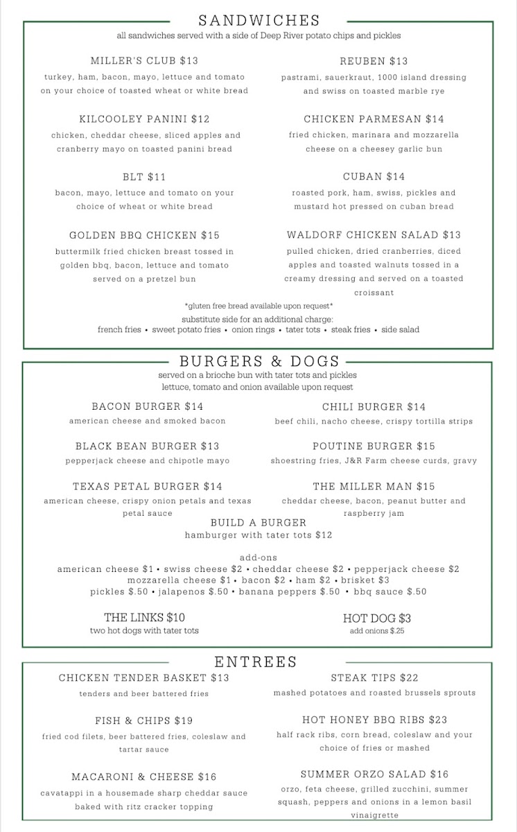 The menu at Miller's Pub offers a diverse selection of dishes, ranging from hearty entrees to satisfying sandwiches and snacks. For a comforting meal, try the Baked Ravioli or the indulgent Mac N Cheese. If you're in the mood for something with a bit of protein, the Steak Tips or Fish and Chips provide a tasty choice. Salad lovers can enjoy fresh options like the Caesar Salad, Crispy Chicken Cobb, or the refreshing Winter Salad. On the sandwich front, there’s something for everyone with the Rachel Panini, the rich Brisket Grilled Cheese, or the zesty Nashville Hot Chicken. For those seeking something unique, the Pesto Grilled Cheese Tomato Soup and Cape Codder Panini are perfect picks. You can also spice things up with the Chipotle Turkey Panini or Golden BBQ Chicken Sandwich. For lighter bites, the Millers Poutine and crispy Coconut Shrimp are excellent choices. A variety of burgers and dogs are on offer, including the classic Bacon Burger and the customizable Build A Burger. For younger guests, the Kids Hot Dog & Tots and Grilled Cheese & Tots are simple yet satisfying. Adding extra sides like Extra Ranch or Honey Jameson can enhance the experience. Whether you're craving a casual snack or a full meal, Miller's Pub offers a great variety that caters to all tastes.